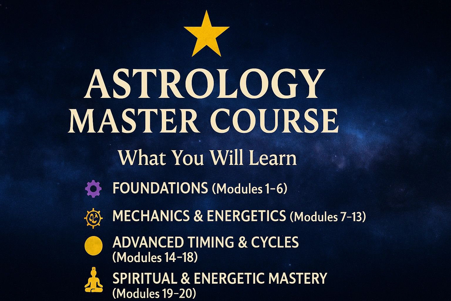 A complete, deep-dive training in real astrology from signs, houses, and aspects to soul wounds, karma, and life purpose.